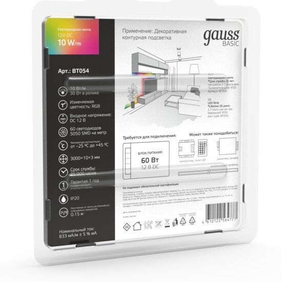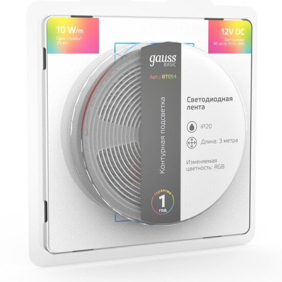 Светодиодная лента Gauss Basic LED 5050/60 12V 10W/m 700lm/m RGB 10mm IP20 3m 1/100 интересное: