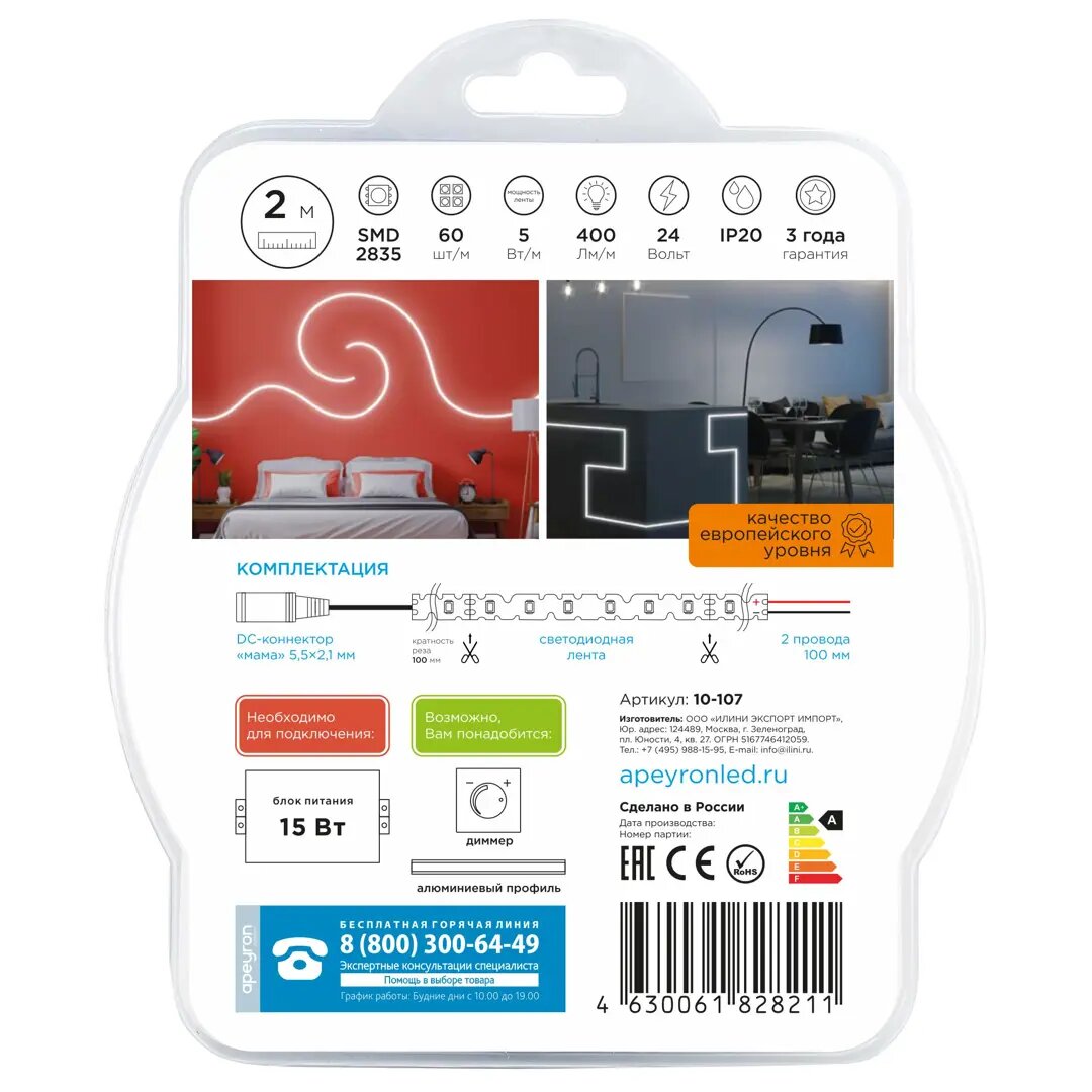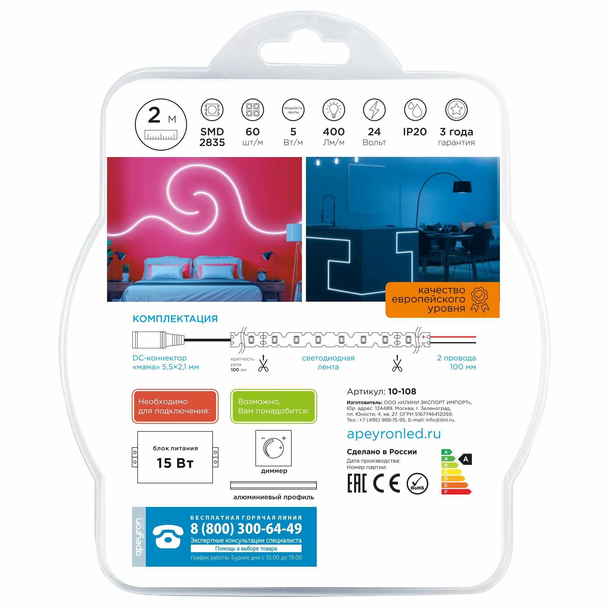 10-21 Комплект светодиодной ленты 12В, 4,8Вт/м, smd3528, 60 д/м, 280 лм/м, IP65, 2,5м, коннектор, БП, т/б