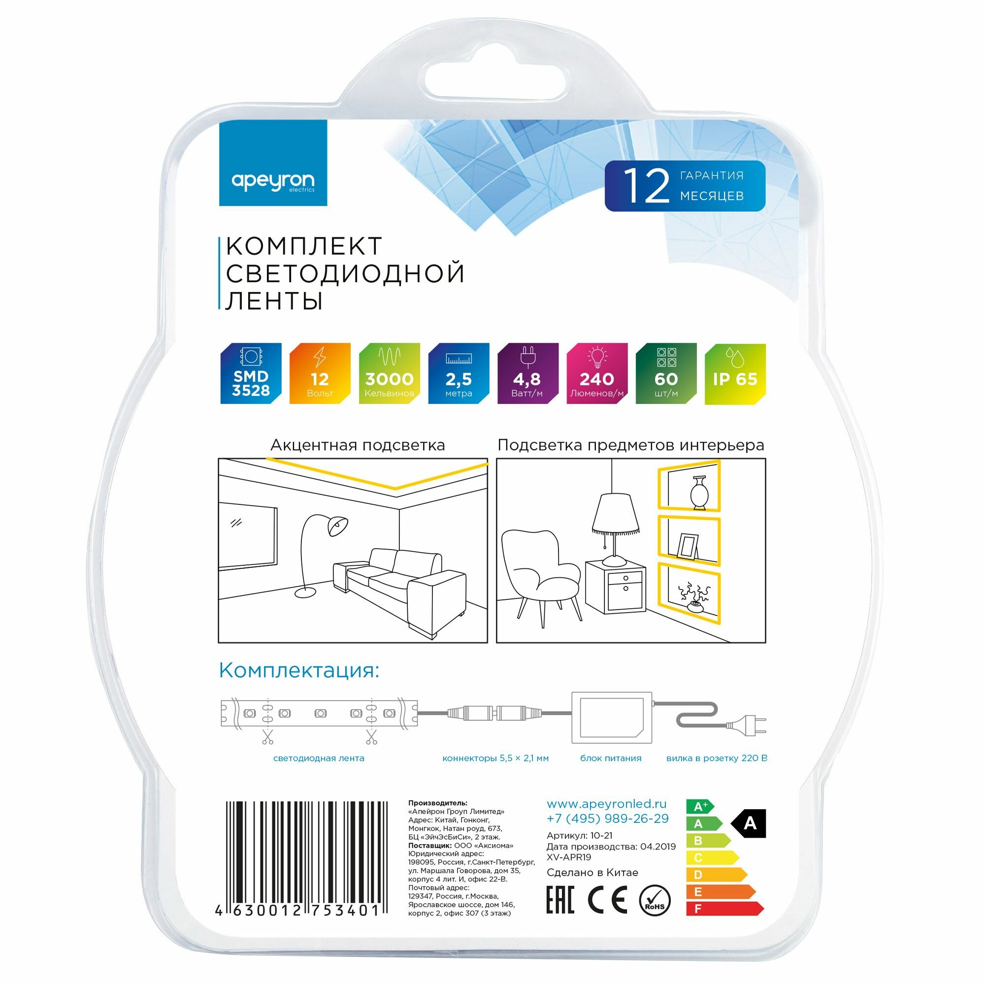 10-21 Комплект светодиодной ленты 12В, 4,8Вт/м, smd3528, 60 д/м, 280 лм/м, IP65, 2,5м, коннектор, БП, т/б