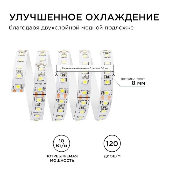 Светодиодная лента Apeyron 12В СТ 8Вт/м smd2835 60д/м 800Лм/м дневной белый (5 м)