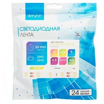 Apeyron (5 м.) Светодиодная лента Apeyron 5W/m 60LED/m 2835SMD холодный белый 5M 00-351