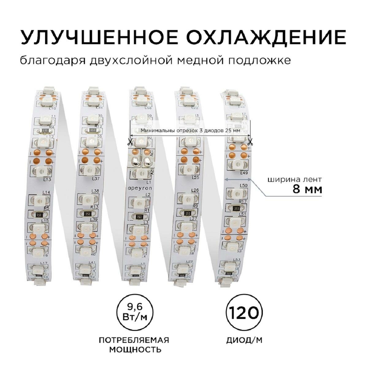 Светодиодная лента Apeyron 12В СТ 8Вт/м smd2835 60д/м 800Лм/м дневной белый (5 м)