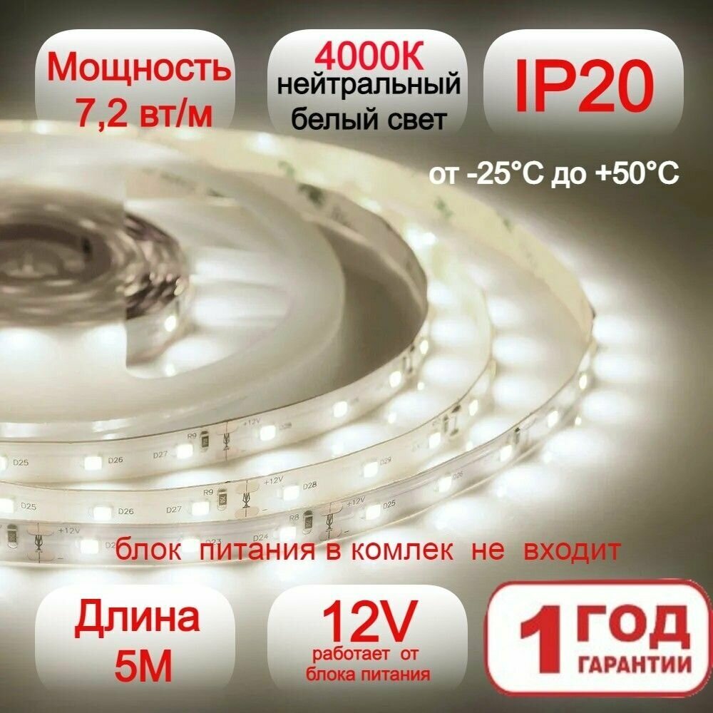 Светодиодная лента 5м 12в, 7,2 вт/м для подсветки дома кухни ресторана, LED 4000К (нейтральный дневной свет)IP20 интересное:
