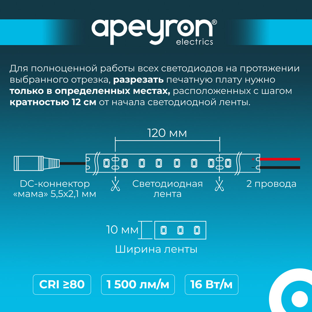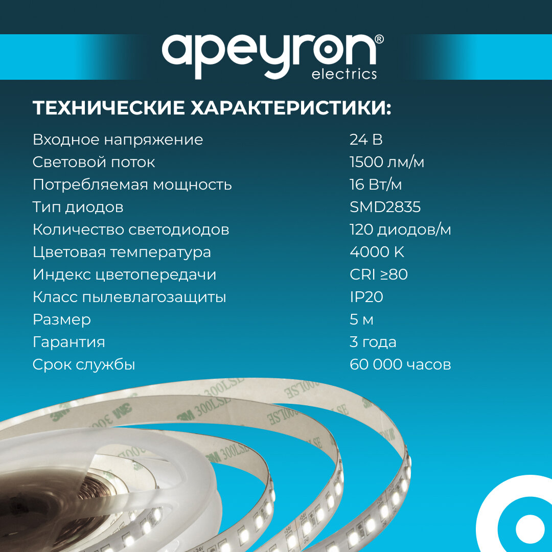 Яркая светодиодная лента Apeyron 00-342 24В, обладает белым цветом 4000K, 1500 Лм/м, 120д/м, 16Вт/м, smd2835, IP20, 5 м, подложки 10 мм интересное: