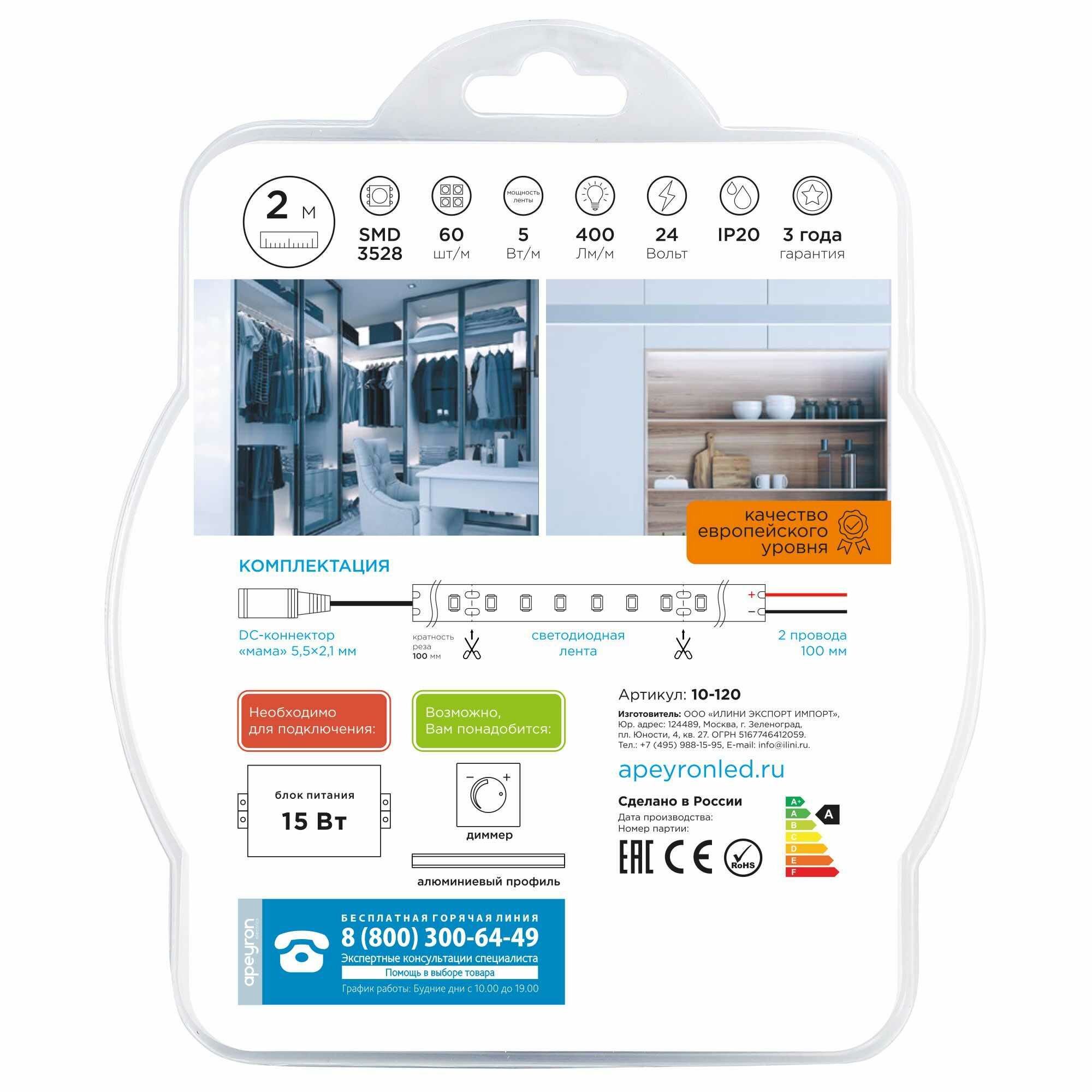 10-21 Комплект светодиодной ленты 12В, 4,8Вт/м, smd3528, 60 д/м, 280 лм/м, IP65, 2,5м, коннектор, БП, т/б