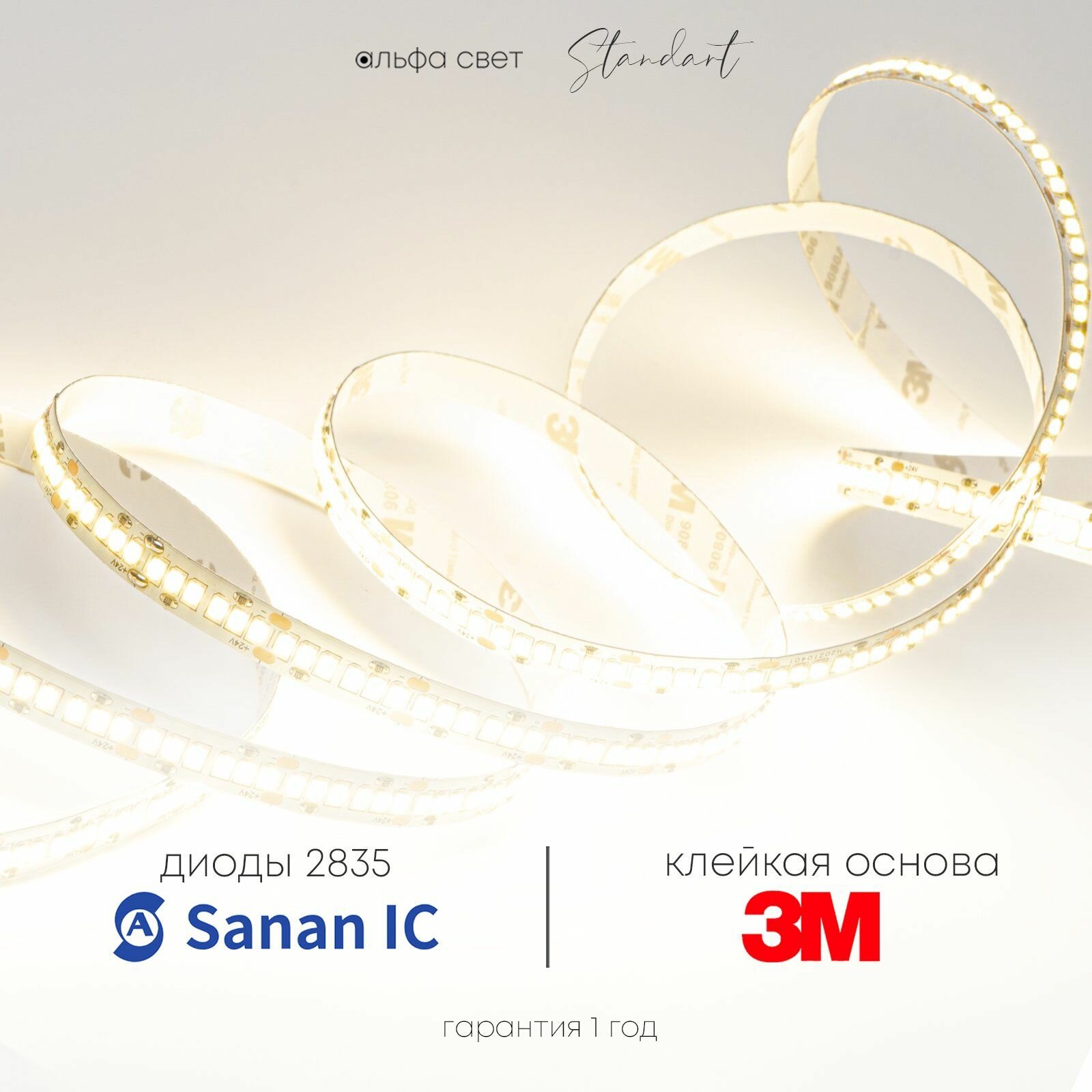 Светодиодная лента 12Вт, 24В, 3000К (тёплый свет), 1200 лм/м, IP20, 5 метров, Альфа Свет