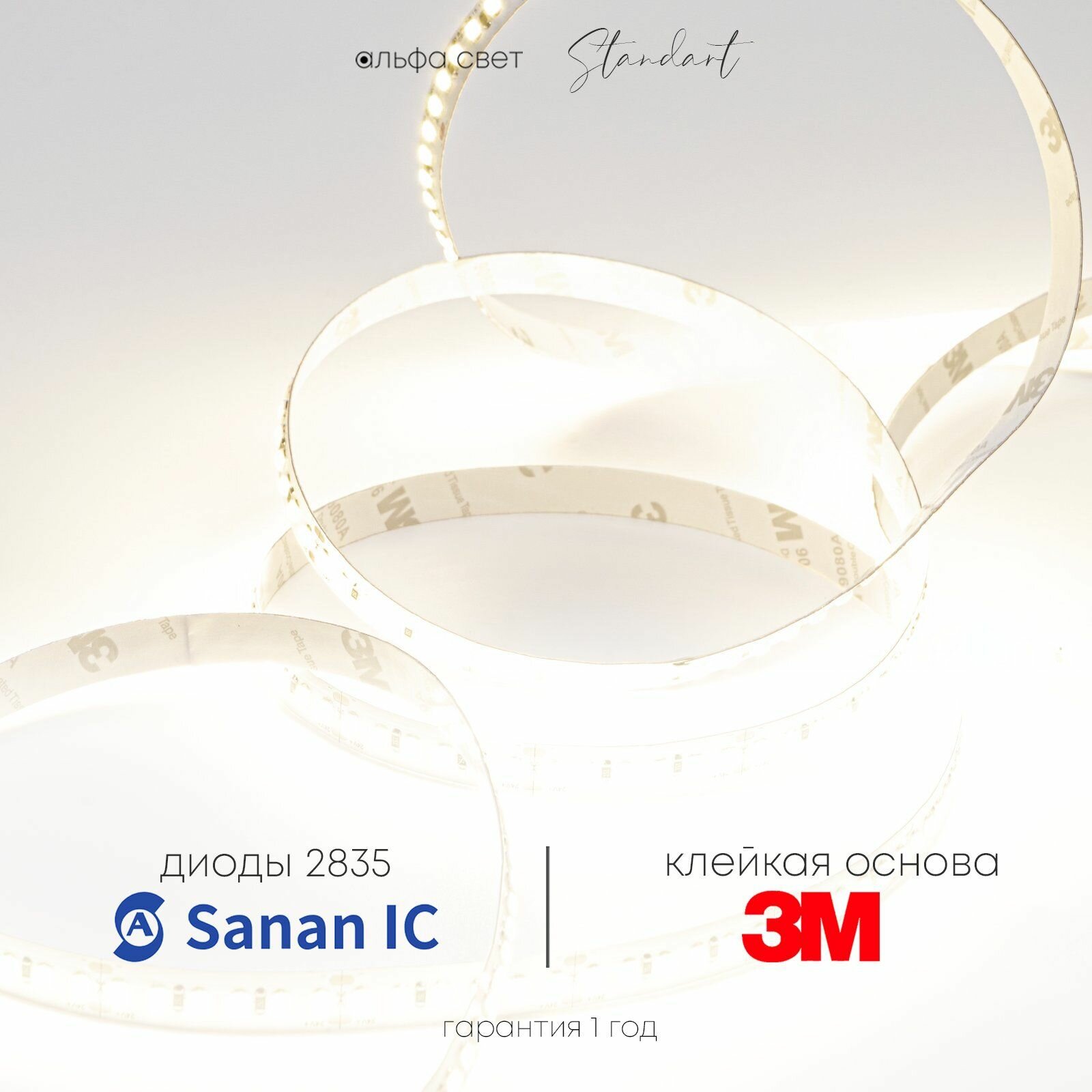 Светодиодная лента 12Вт, 24В, 3000К (тёплый свет), 1200 лм/м, IP20, 5 метров, Альфа Свет