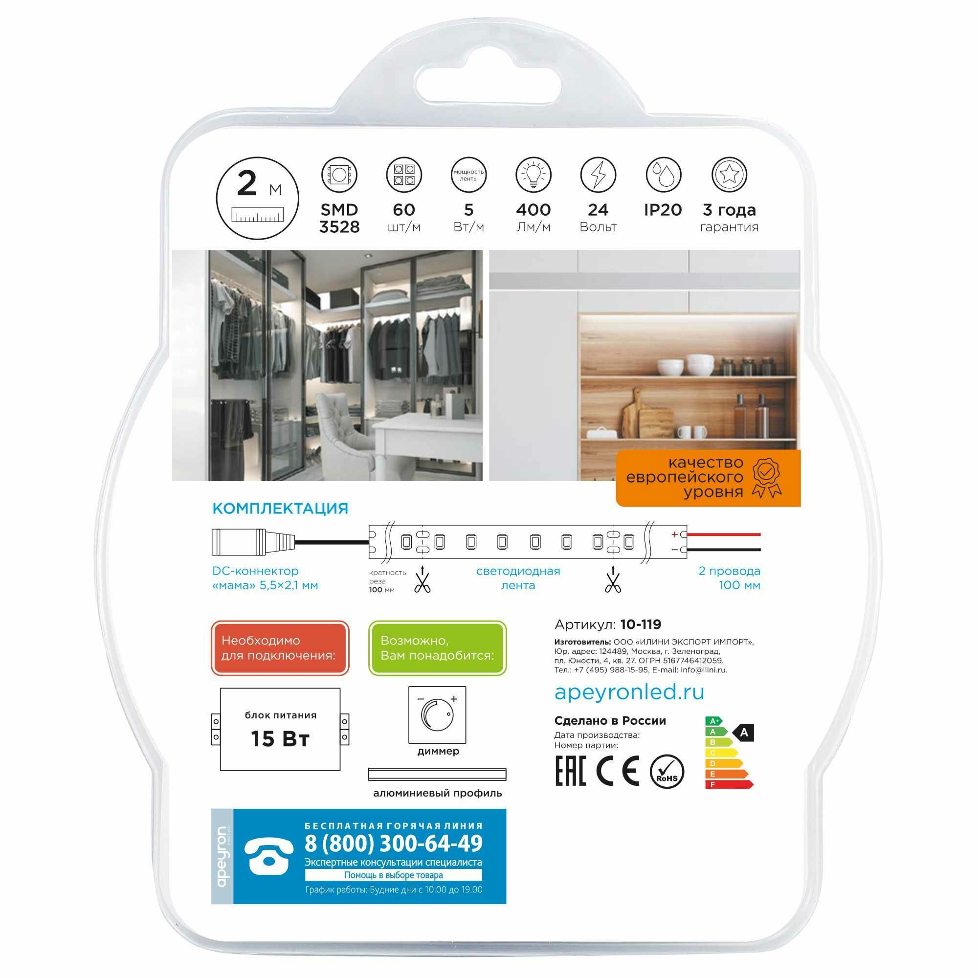 10-21 Комплект светодиодной ленты 12В, 4,8Вт/м, smd3528, 60 д/м, 280 лм/м, IP65, 2,5м, коннектор, БП, т/б