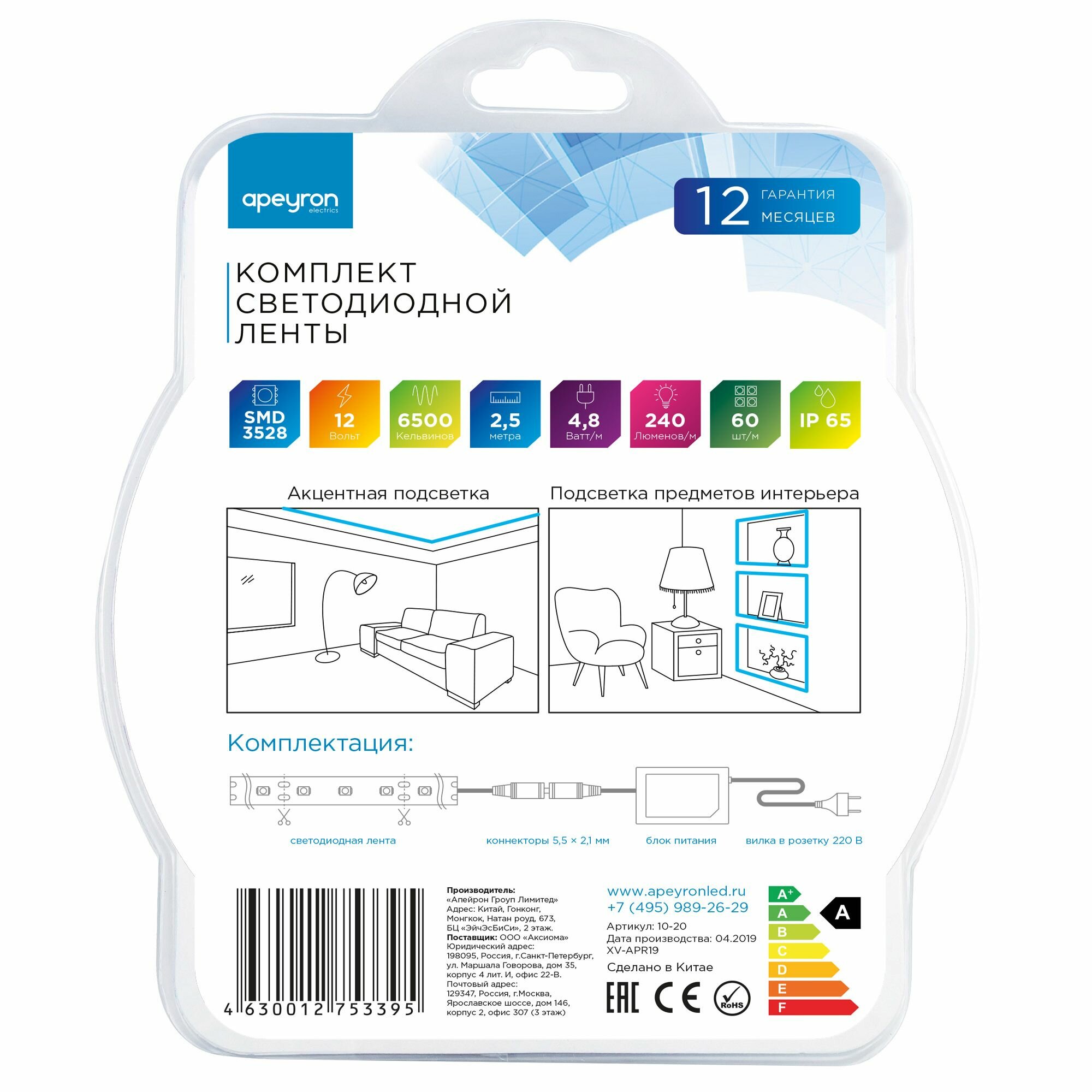 10-21 Комплект светодиодной ленты 12В, 4,8Вт/м, smd3528, 60 д/м, 280 лм/м, IP65, 2,5м, коннектор, БП, т/б