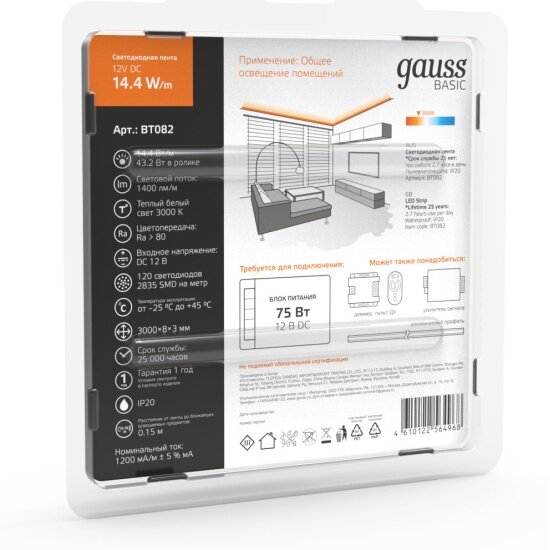 Светодиодная лента Gauss Basic LED 2835/120 12V 14,4W/m 1400lm/m 3000K 8mm IP20 3m 1/100 интересное: