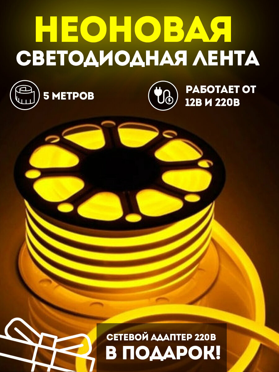Купить Неоновая светодиодная лента 5м, 6х12мм, 220В, 120 LED/m, IP 67, гибкий неон, желтый