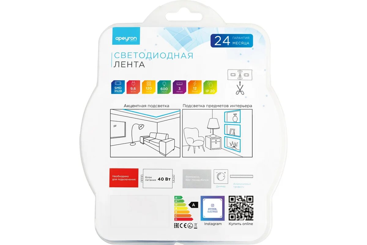 Светодиодная лента APEYRON в блистере 12В, СТ, 9,6Вт/м, smd3528 214BL интересное: