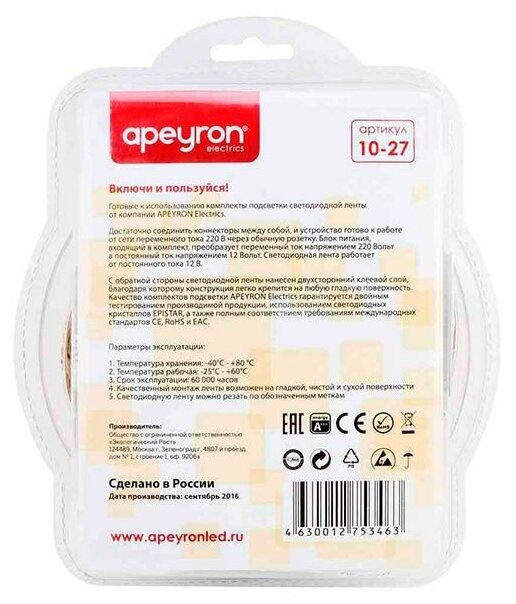 Ниже Вы можете прочитать отзывы на Комплект светодиодной ленты Apeyron 12В, 4,8Вт/м, smd3528, 60д/м, теплый белый, 5м, ознакомится с подробными характеристиками, посмотреть интересные обзоры и фотографии на Комплект светодиодной ленты Apeyron 12В, 4,8Вт/м, smd3528, 60д/м, теплый белый, 5м.