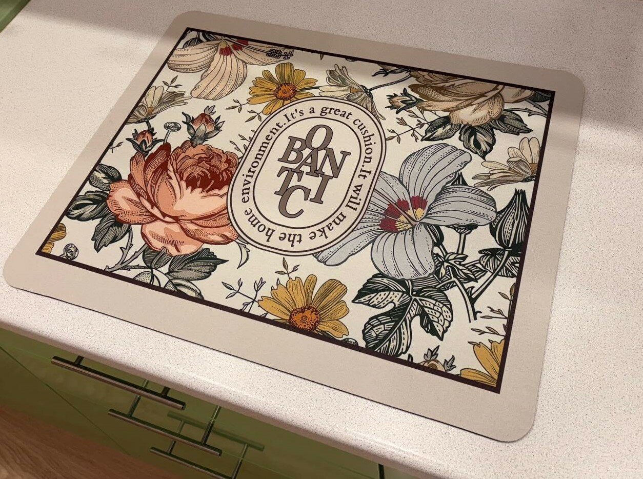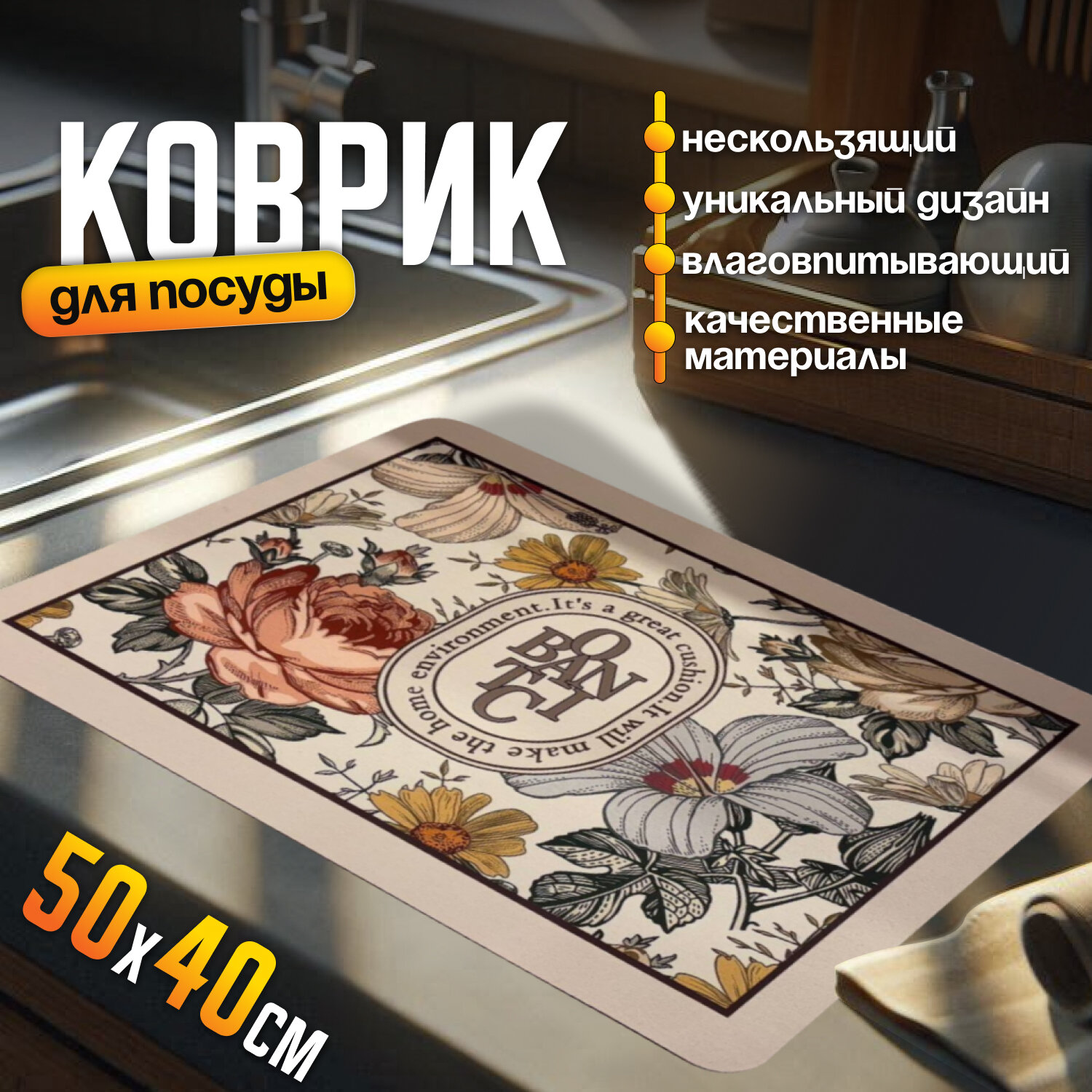 Коврик для посуды 50x40см, влаговпитывающий, нескользящая поверхность, цветочный принт, бежевый интересное: