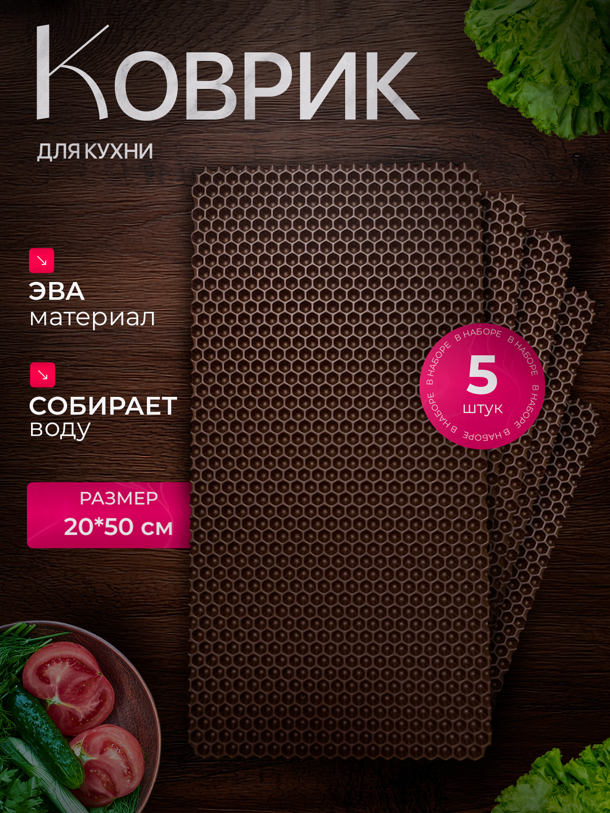 СохранитьНабор Эва ковриков для сушки посуды из пяти штук, 20х50см , коричневые соты / Для кухни / Eva, Ева интересное: