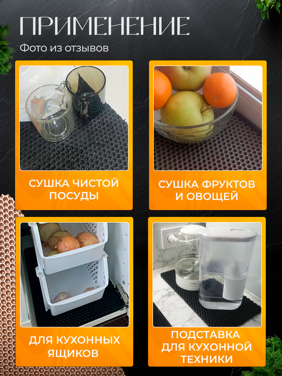 Барный коврик 20х40 см для сушки посуды 5 шт, черные соты