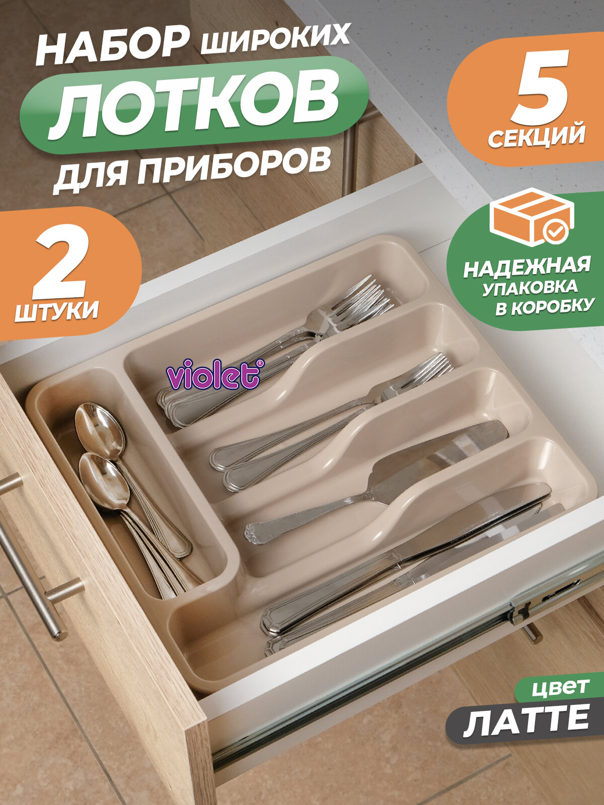 Купить Лоток для столовых приборов Violet широкий, набор 2шт, цвет латте / подставка для хранения ложек и вилок в ящике стола