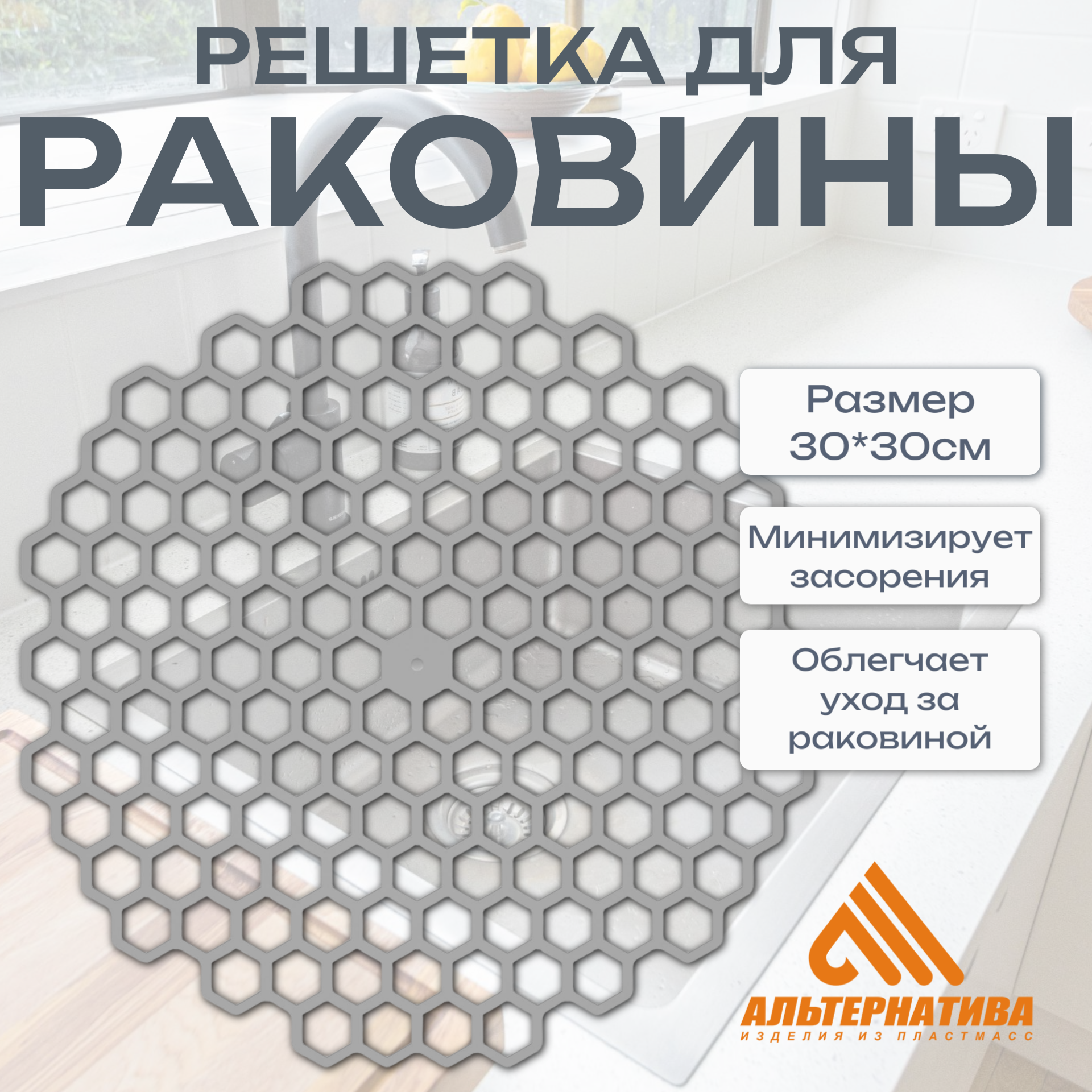 Решетка для мойки Альтернатива "Соты", встраиваемая, серая, 30х30см интересное: