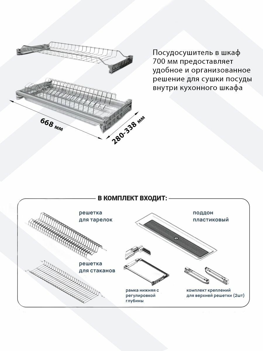 Сушилка двухуровневая без рамки для посуды в кухонный ящик 700 мм, отделка серая, 1 шт.