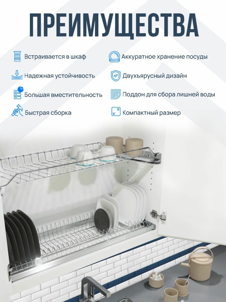 Сушилка для посуды в шкаф 90 см, серая, двухъярусная, с поддоном, сталь