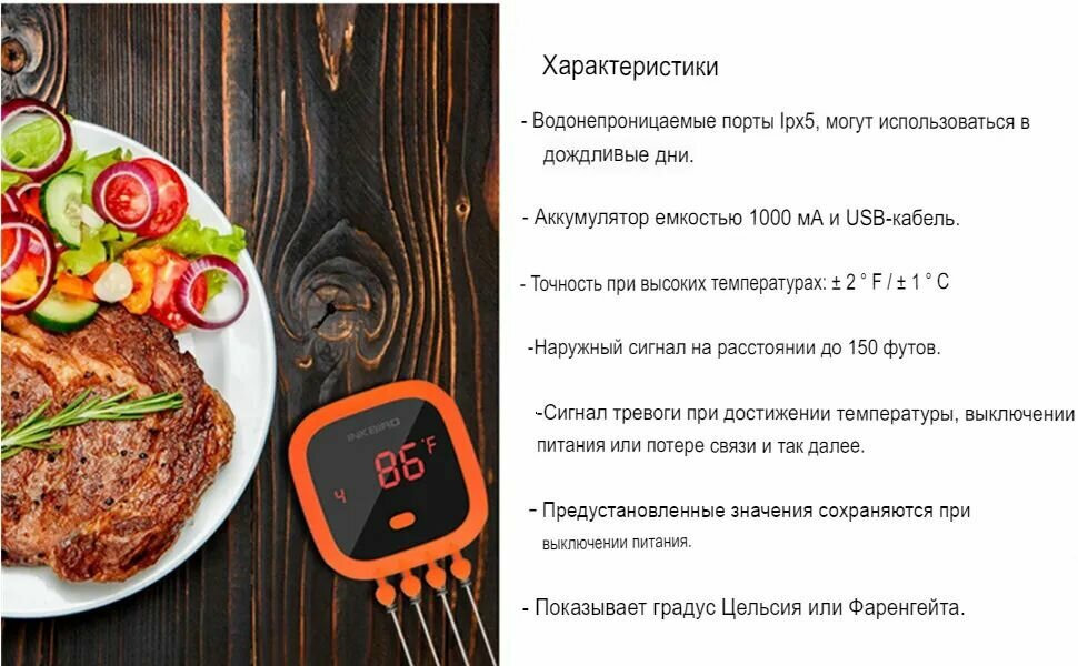 Купить Кулинарный термометр INKBIRD IBT-4XC, 4 щупа, Bluetooth, зонд 14см
