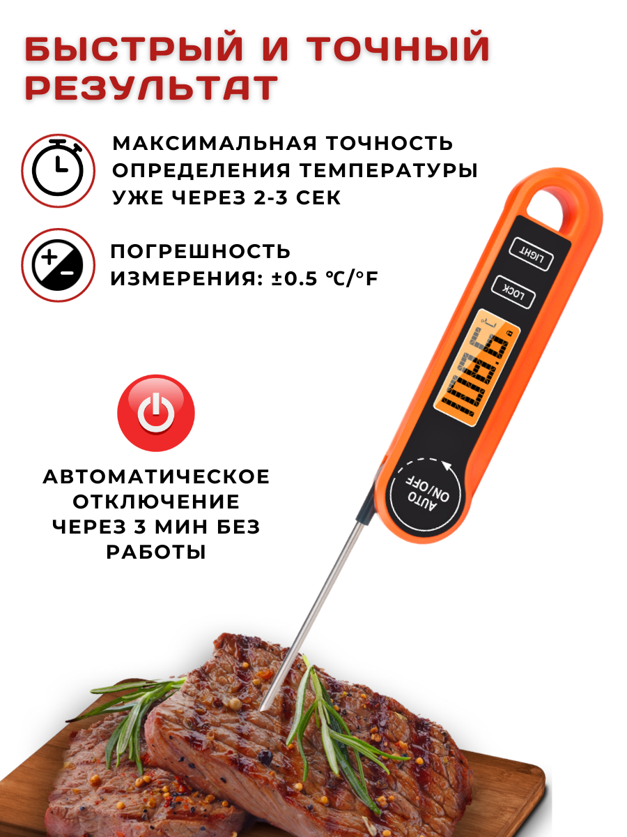 Кулинарный термометр электронный со щупом из нержавеющей стали, термометр для еды, мяса, вина, провод 1 метр / таймер кухонный