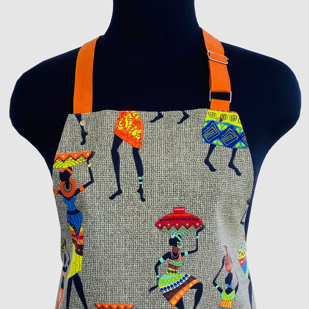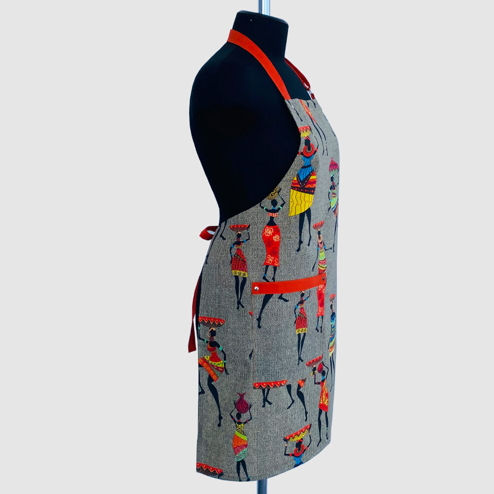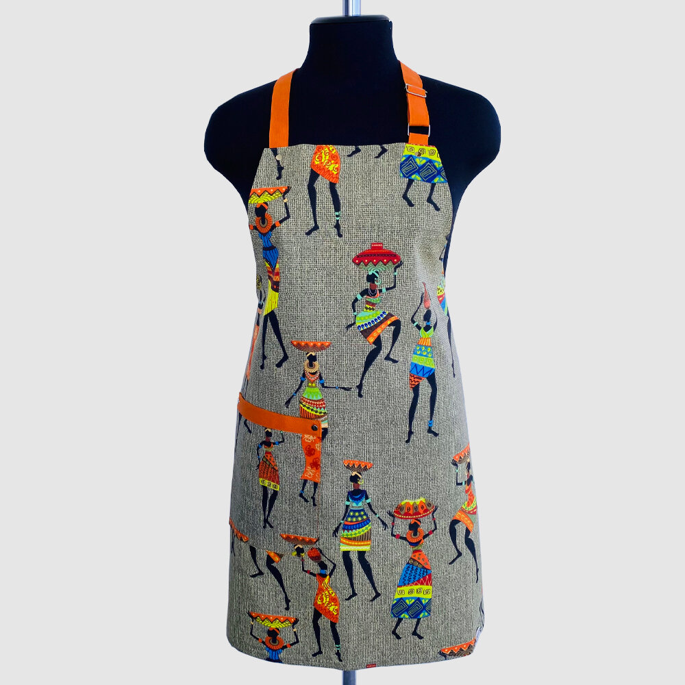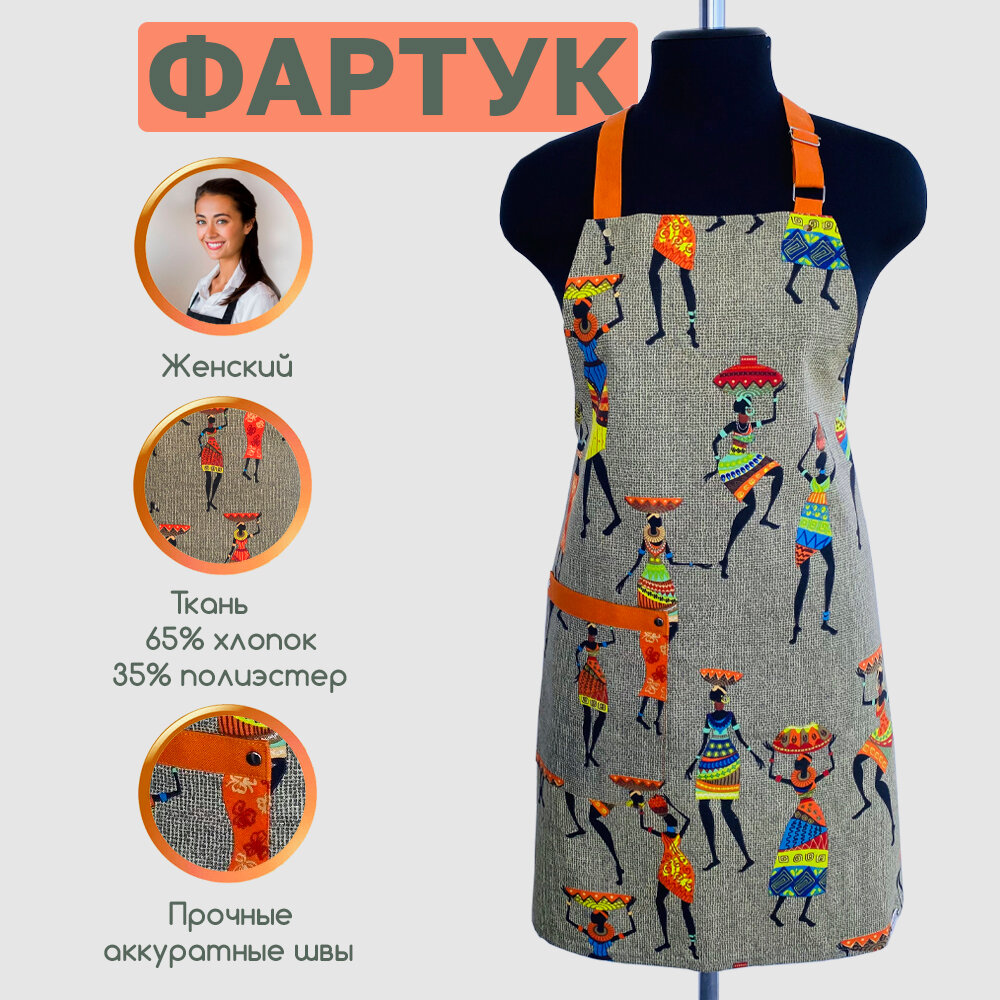 Фартук кухонный женский "Африканские мотивы", цвет Хаки с бретельками и поясом оранжевого цвета. интересное: