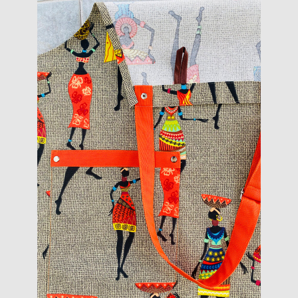 Фартук-передник кухонный женский "Африканские мотивы", цвет Хаки с Оранжевым поясом и 2 карманами.