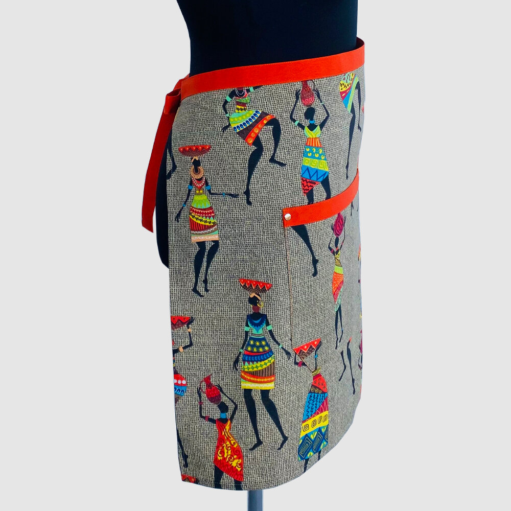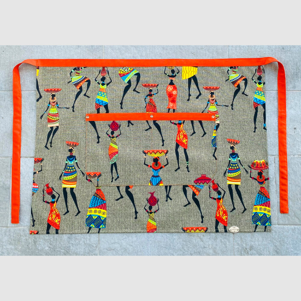 Купить Фартук-передник кухонный женский "Африканские мотивы", цвет Хаки с Оранжевым поясом и 2 карманами.