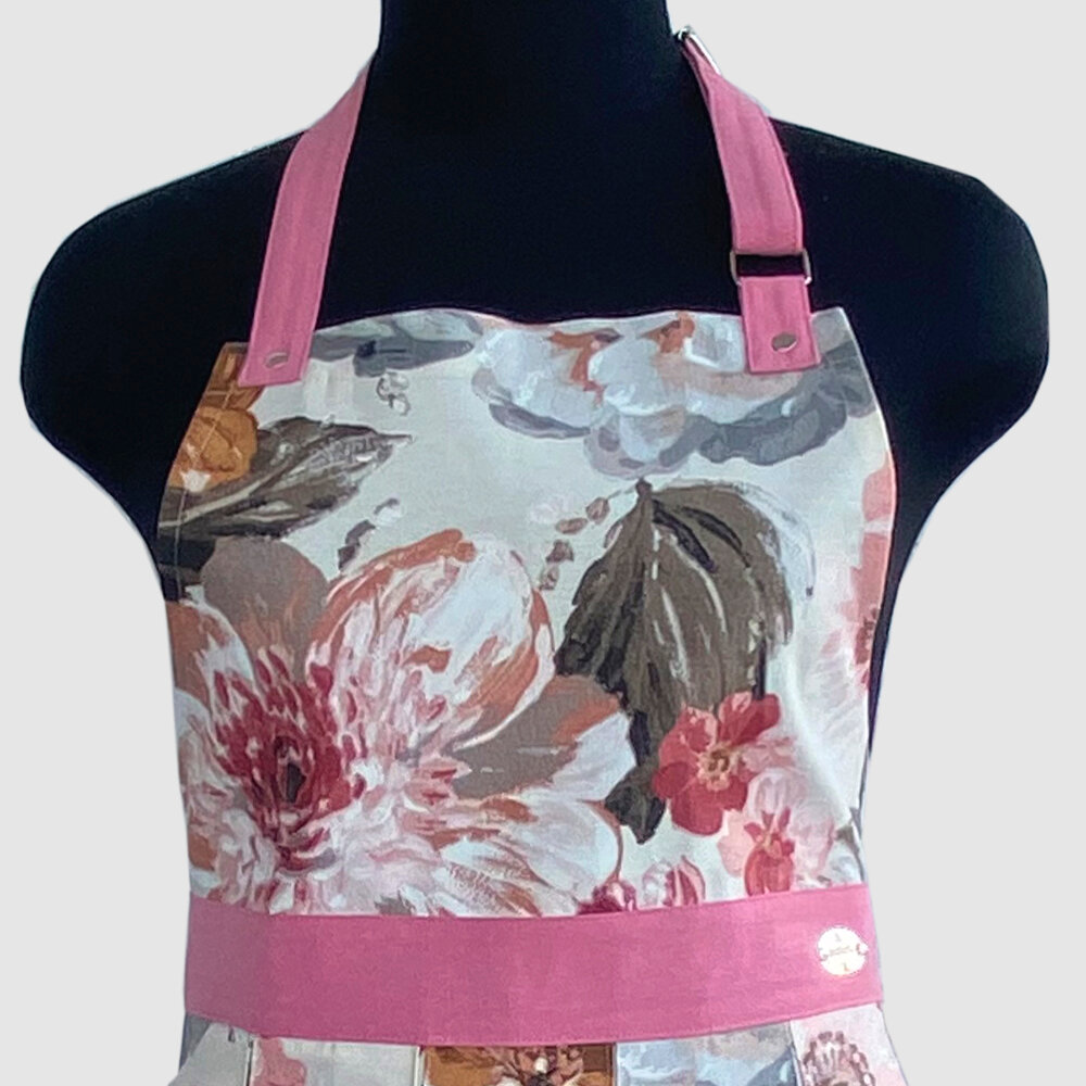 Купить Фартук женский с водоотталкивающей пропиткой, принт "Пионы" с кораллово-розовыми бретельками и поясом.