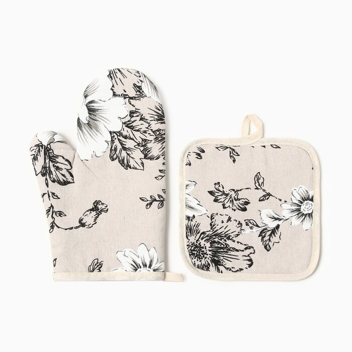 Кухонный набор 2 пр. Доляна "Цветы" прихватка 17*17см, Варежка-прихватка 26*16см,100%хл, 10513419