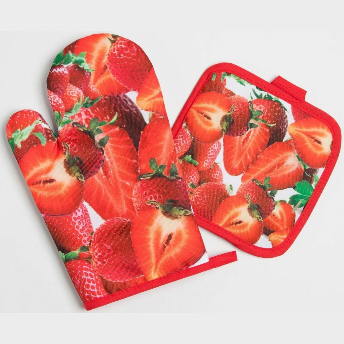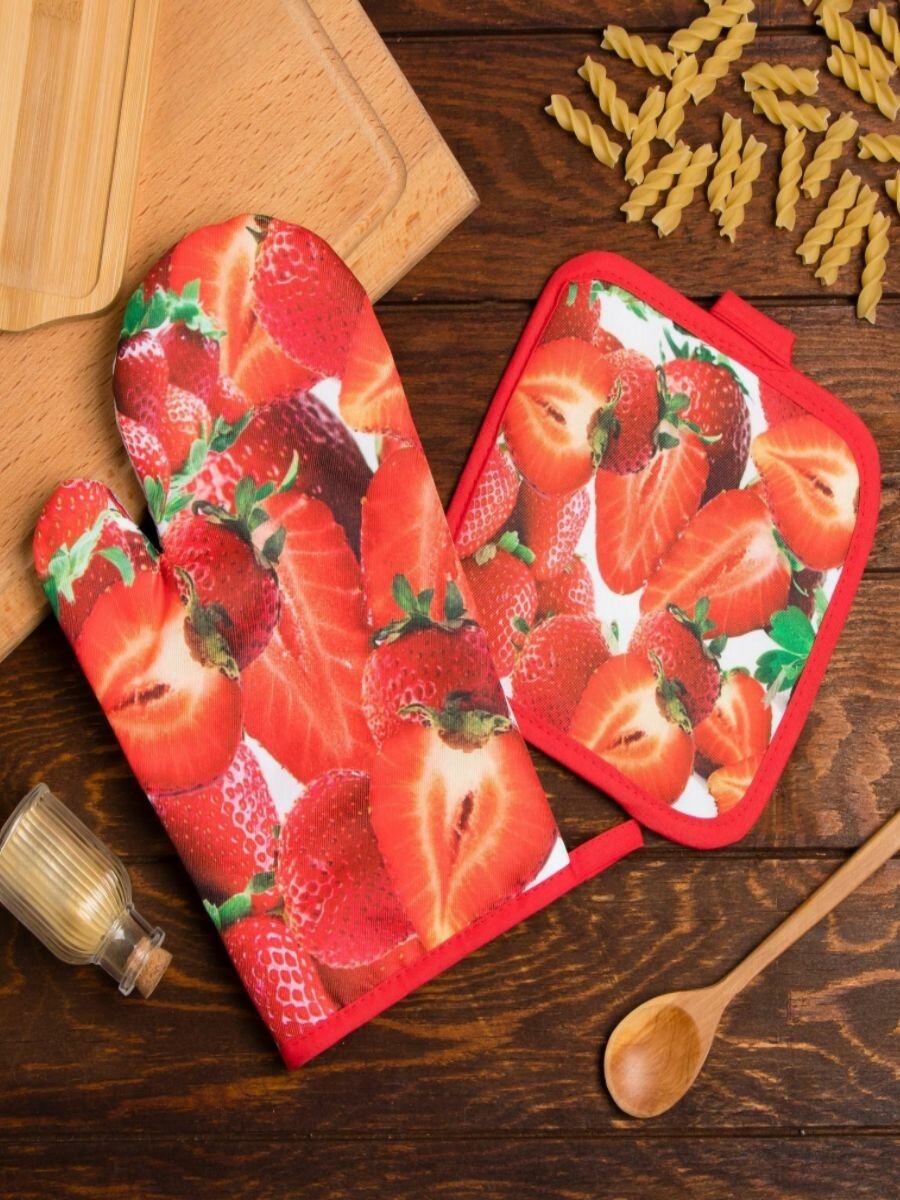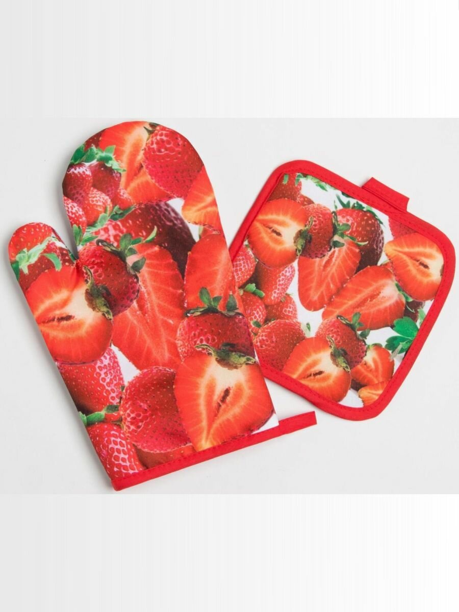 Купить Кухонный набор Доляна Клубника , прихватка 17*17 см, рукавица 26*16 см,100% п/э