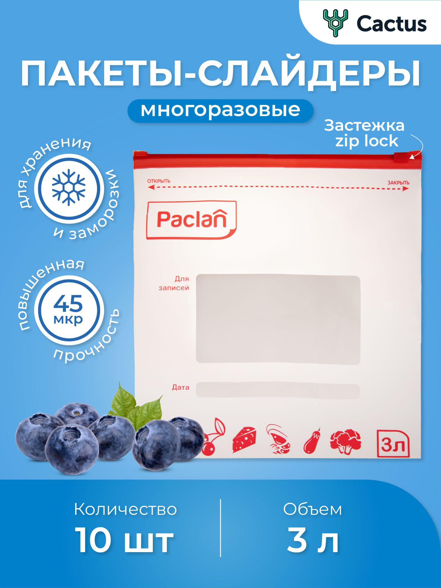 Зип пакеты для заморозки с замком застежкой zip lock, пакеты слайдеры плотные, 45 мкм, 27 х 28 см, 3л, 10 шт, Paclan интересное:
