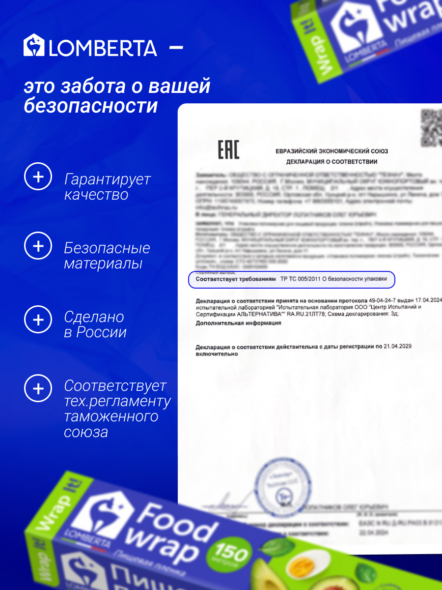 Пищевая пленка Lomberta 150м, полиэтилен, 6мкм, рулонная, для упаковки и хранения продуктов