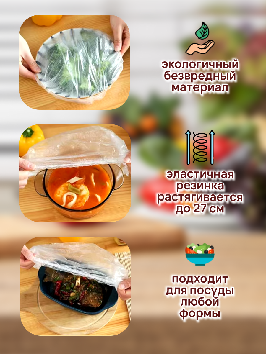 Крышка-пакет 200шт на резинке 27 см, набор пакетов для хранения продуктов / Holiday-House интересное: