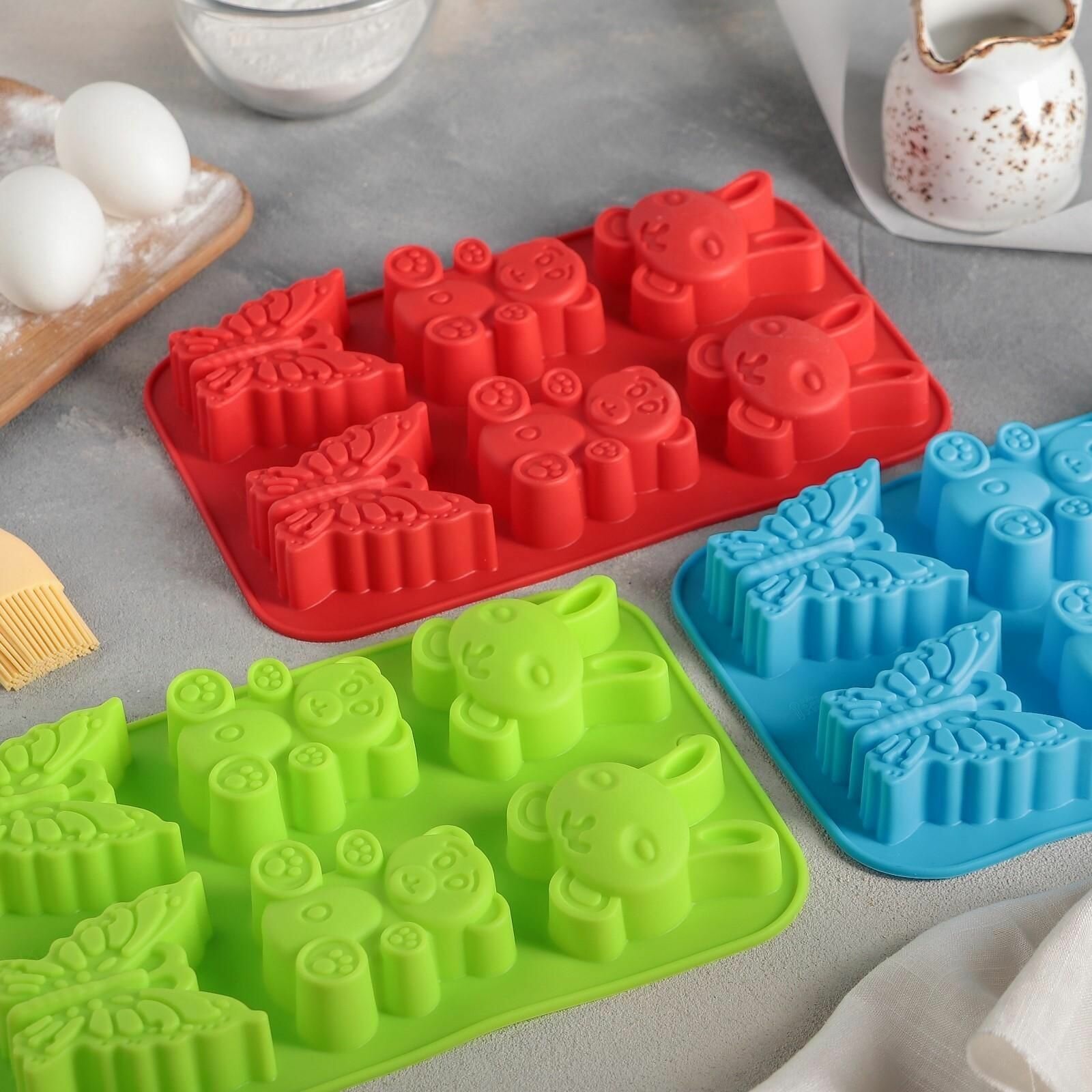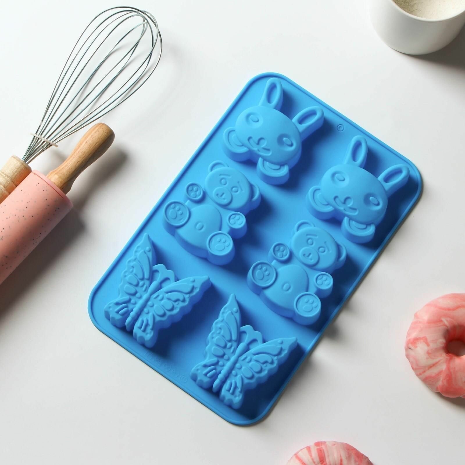 Купить Форма силиконовая для выпечки Заяц, мишка, бабочка, 26x17 см, 6 ячеек синий
