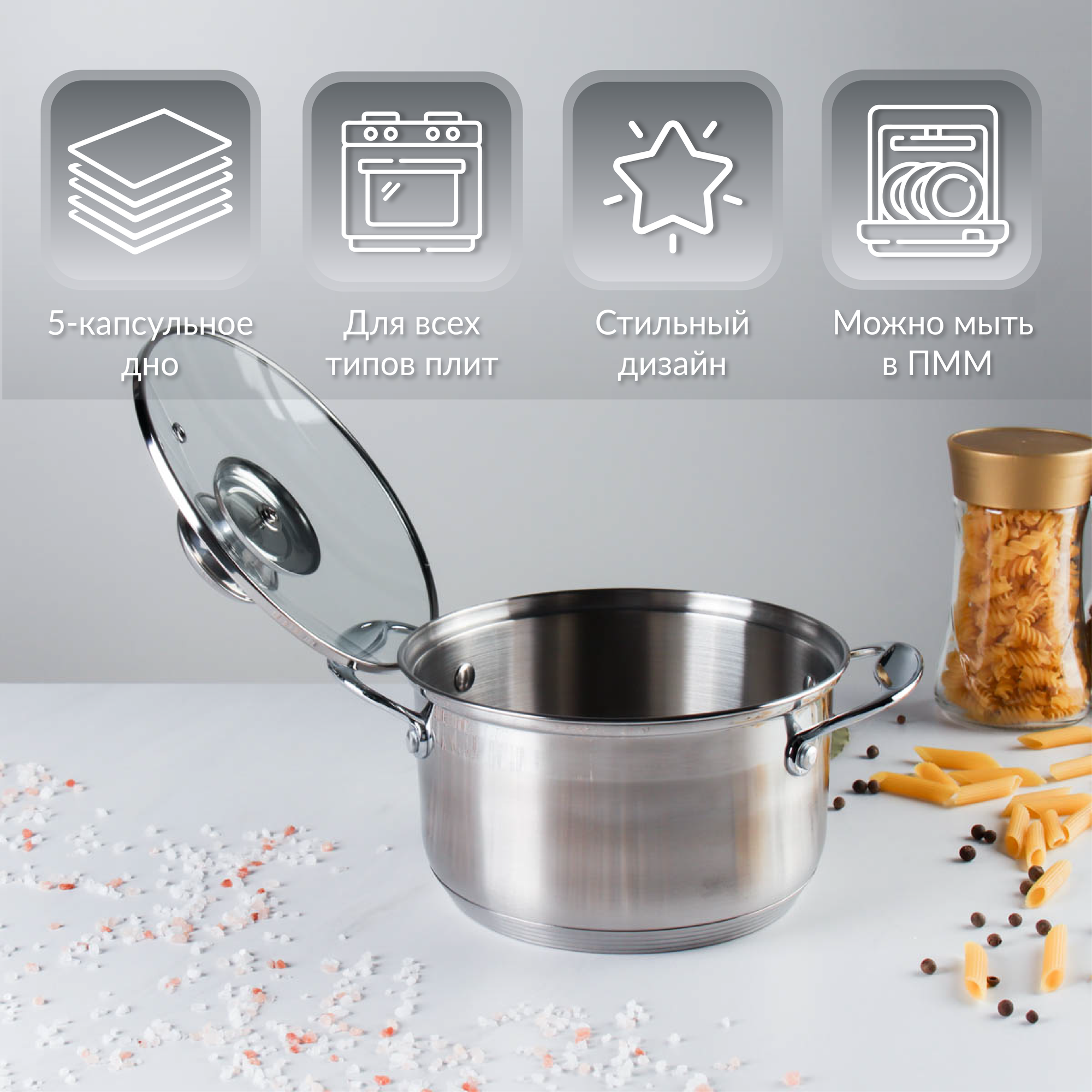 Кастрюля нержавеющая сталь Ария 4,4 л для всех типов плит / индукция