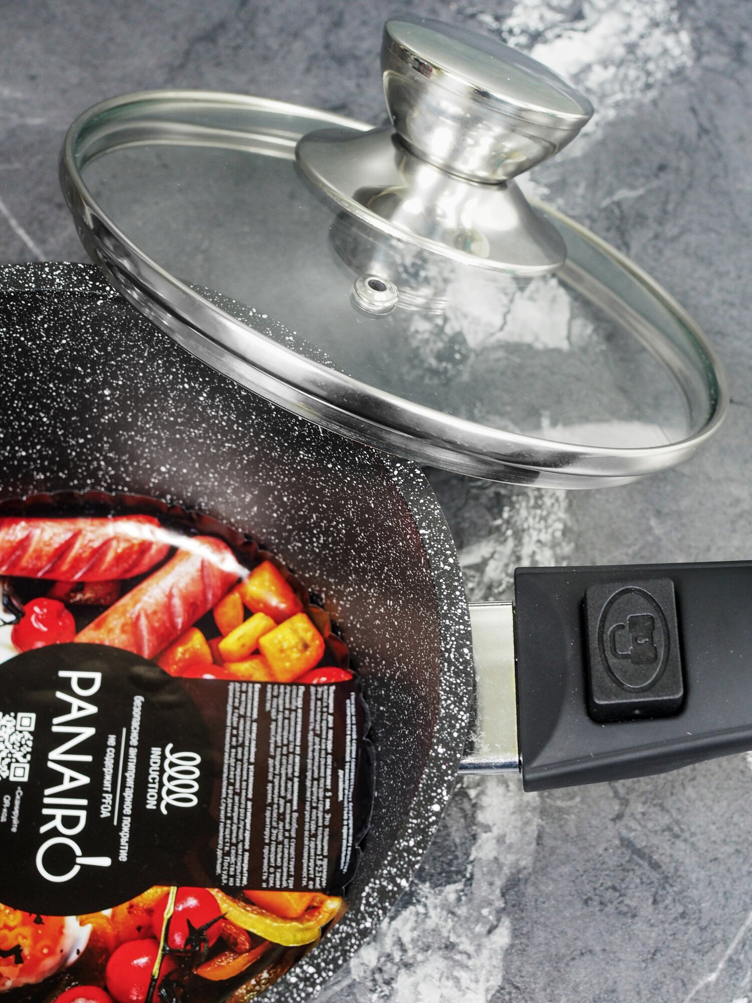 Стеклянная крышка 28 см с силиконовыми ободом и ручкой Panairo