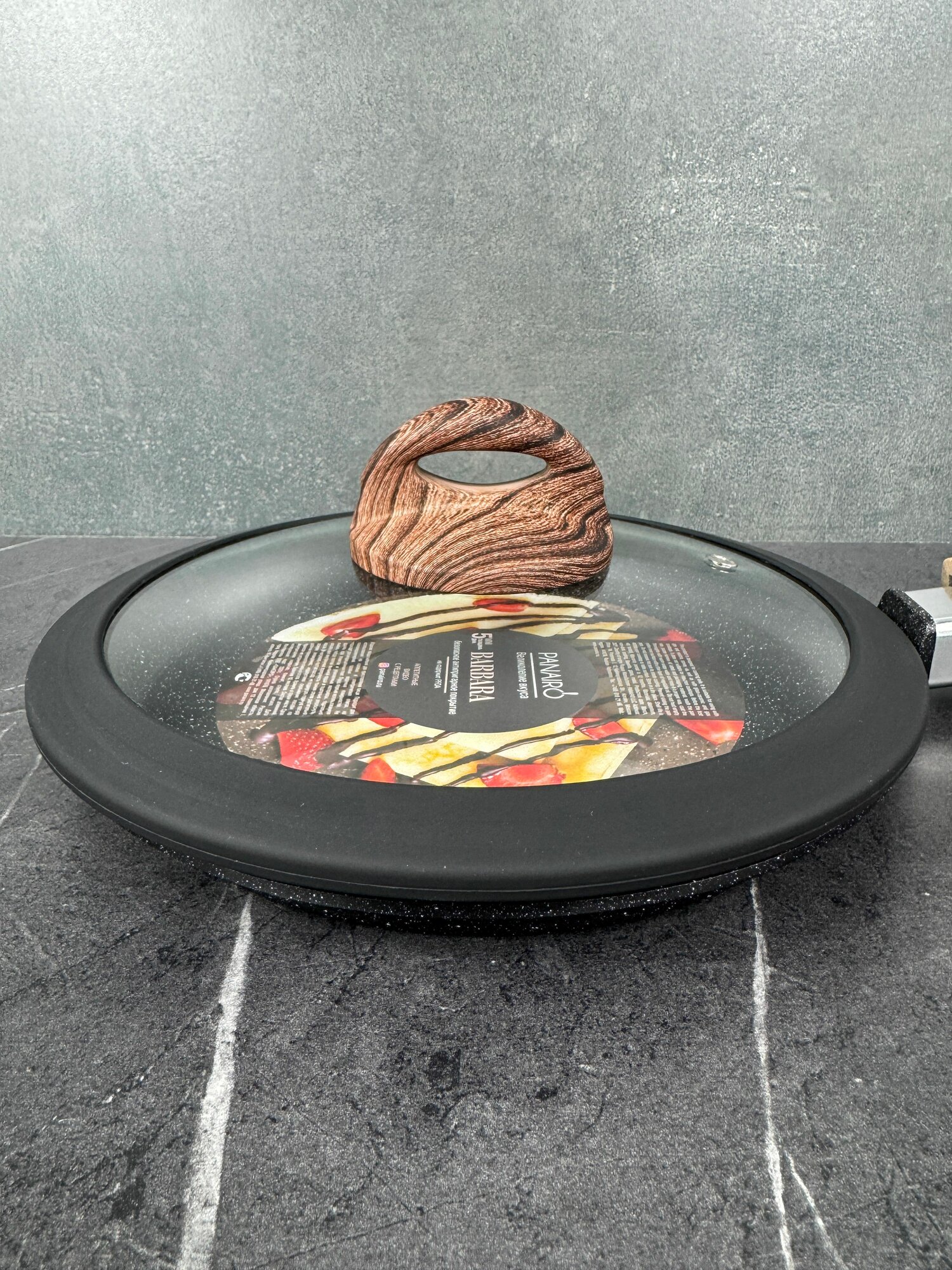 Стеклянная крышка 28 см с силиконовыми ободом и ручкой Panairo