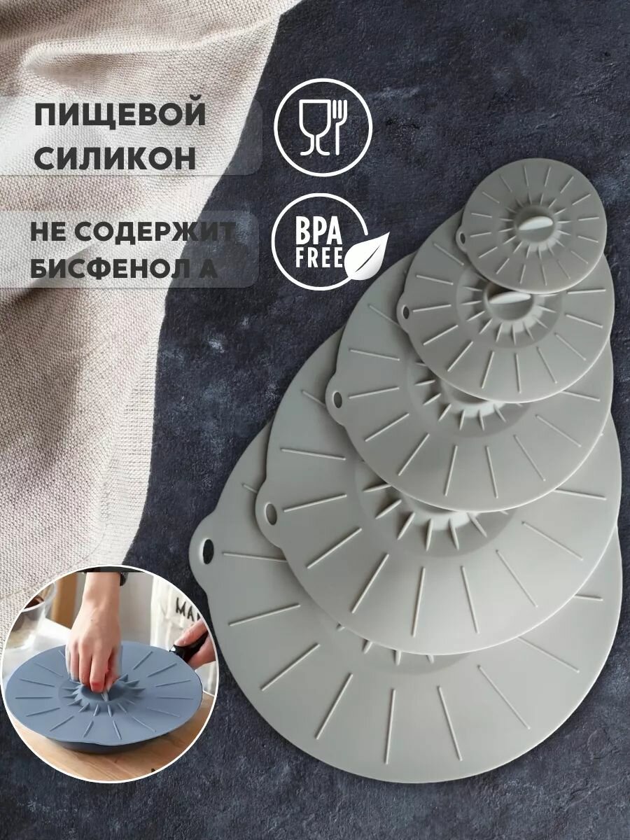 Силиконовые вакуумные, универсальные крышки для посуды. Набор из 5 шт. Светло-серые