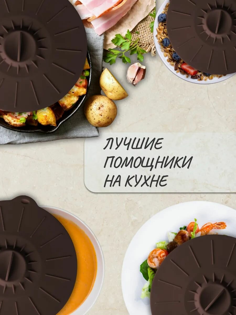 Силиконовые вакуумные, универсальные крышки для посуды. Набор из 4 шт. Коричневые