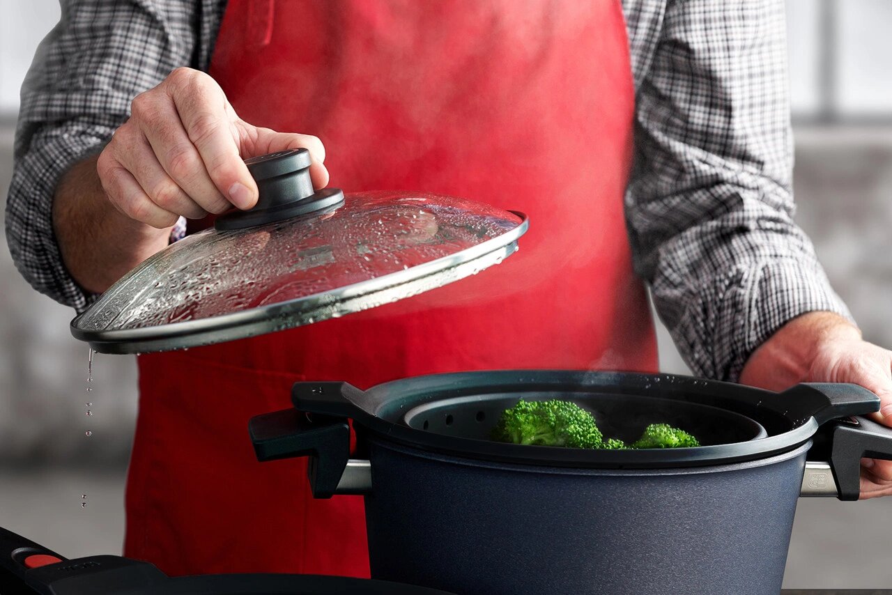 Крышка стеклянная жаропрочная с металлическим ободком WOLL d-24 см, боросиликатное стекло интересное: