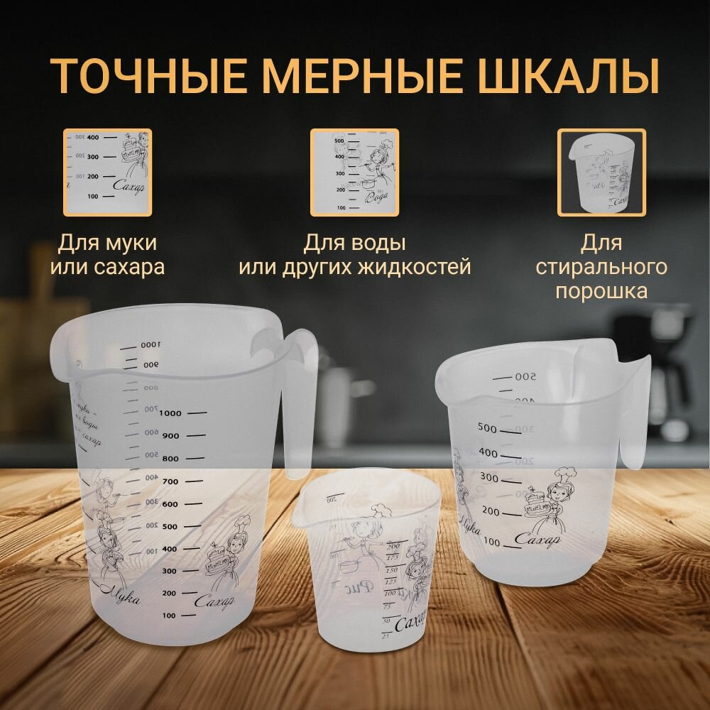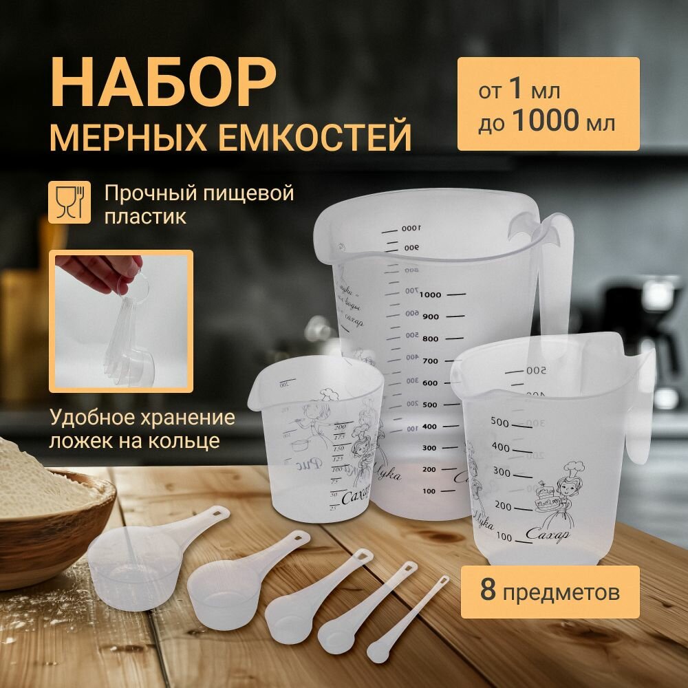 Мерный стакан, графин и ложки, емкости SparkPlast, набор 8 шт, 1000 мл 500 мл 200 мл 100 мл 50 мл 15 мл 5 мл 1 мл. интересное: