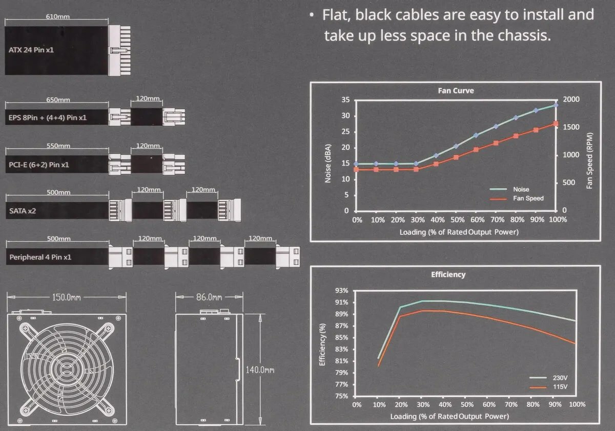 | Плюсы: | Отличный блок, не шумный, длины кабелей хватает |