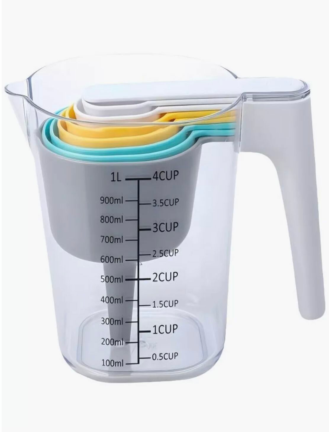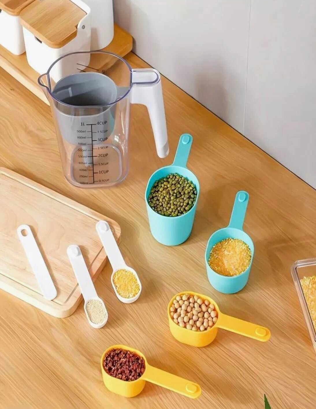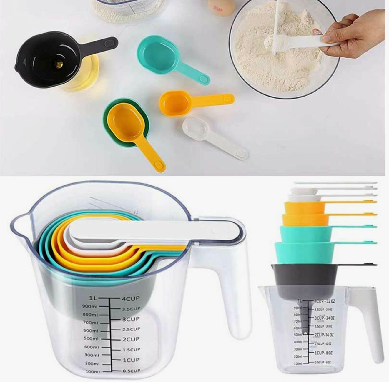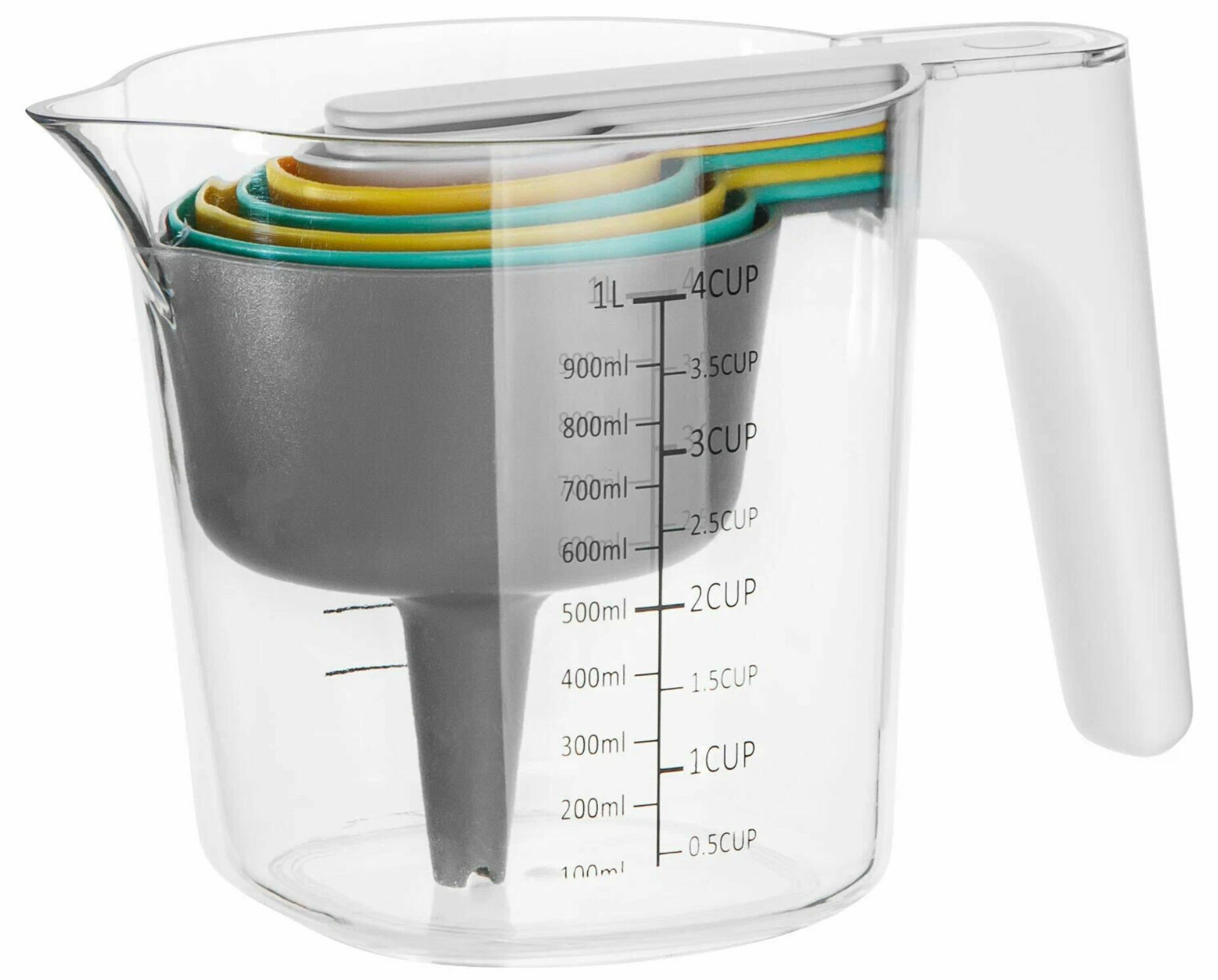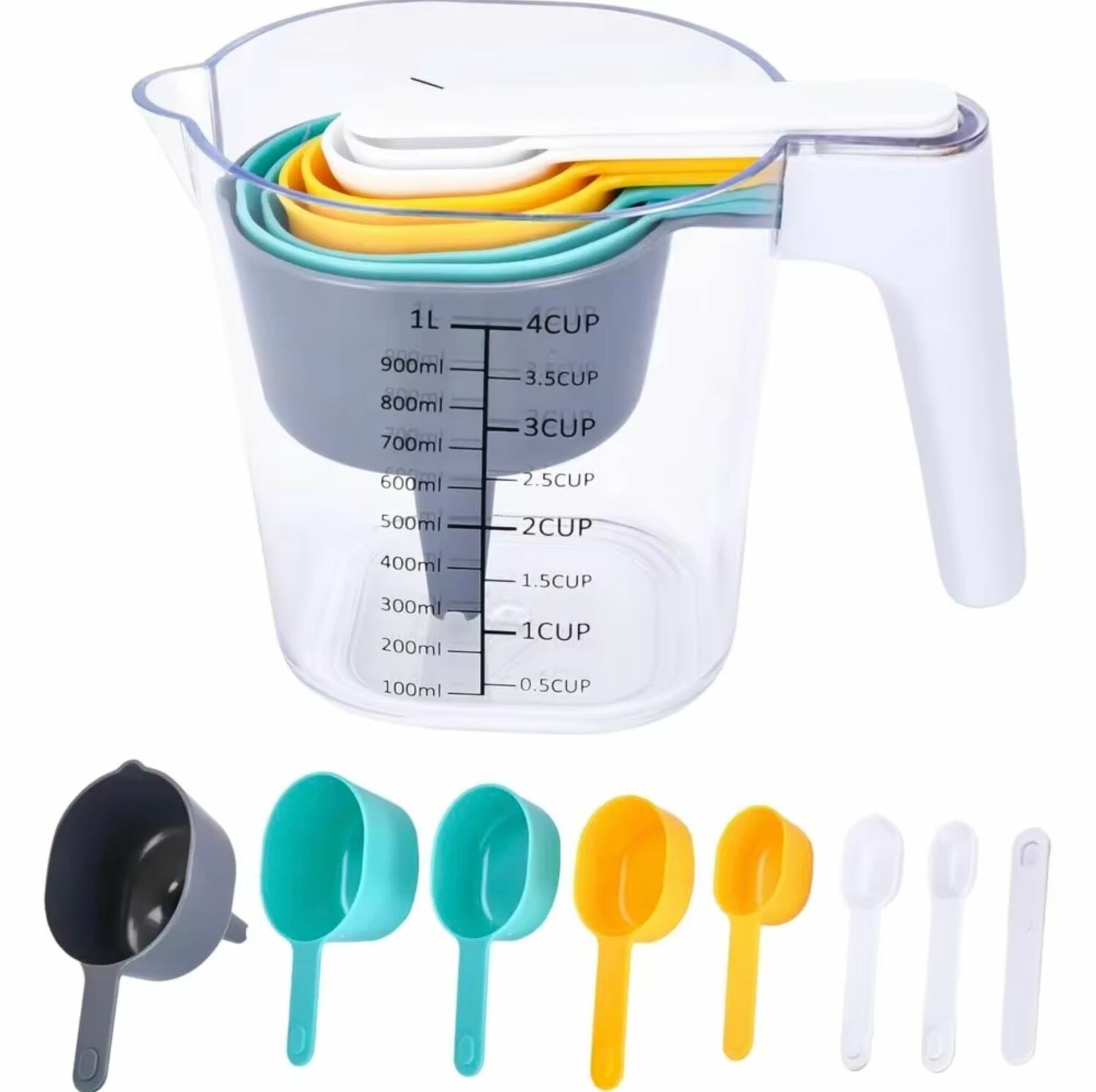 DE.HOME Набор мерных емкостей, мерный стакан, воронка, скребок, ложки разного объема, 9 шт. разноцветные интересное: