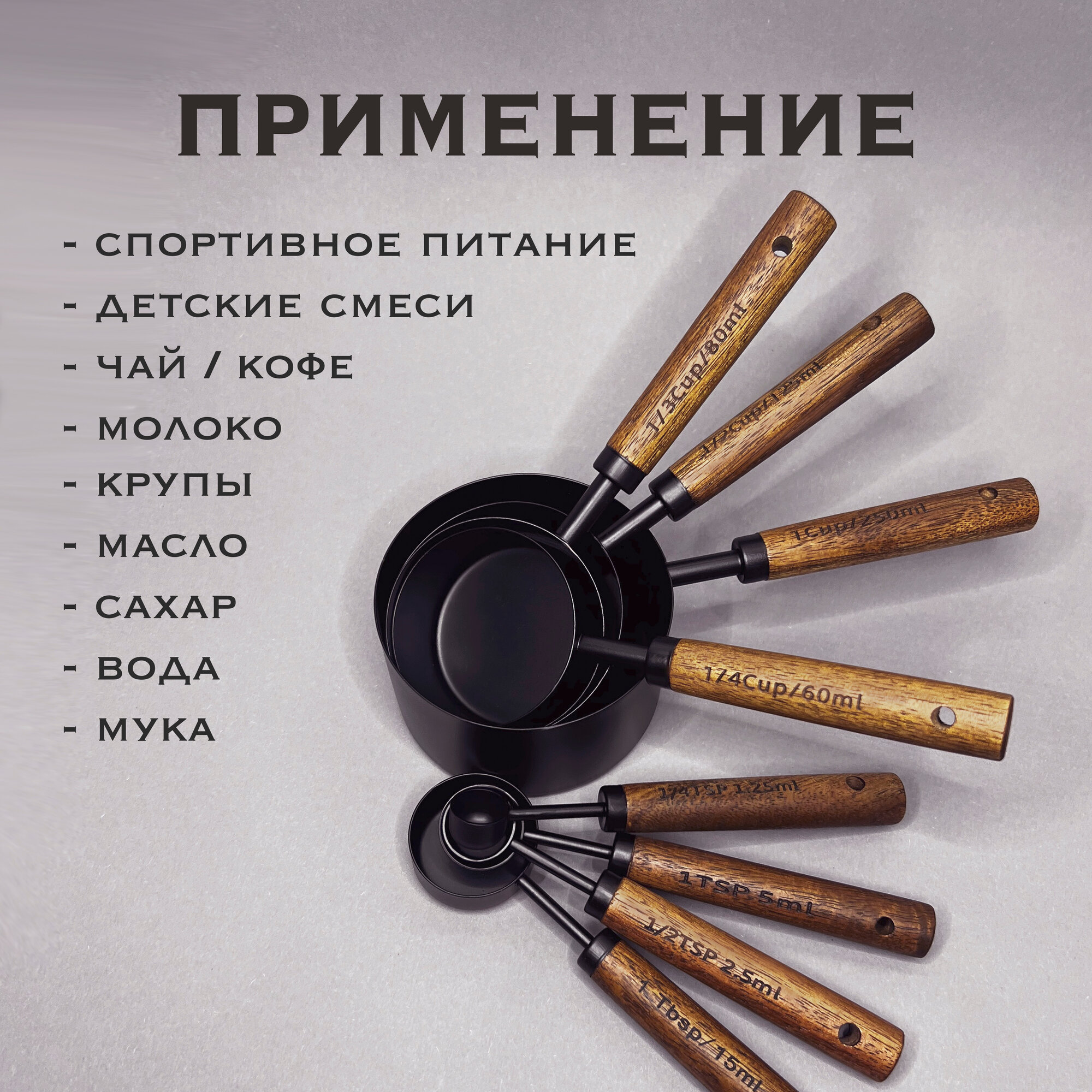 Большой набор из 8 черных мерных ложек ФОРМА с деревянной ручкой интересное:
