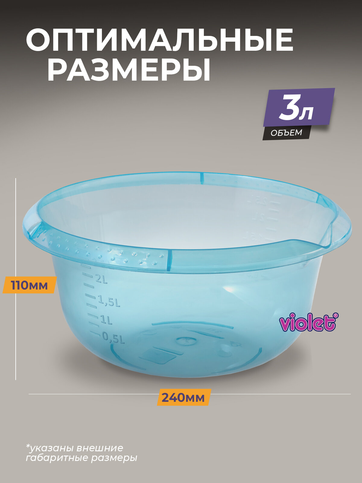 Миска с мерными делениями "VIOLET", 2л, 22х22х15см, цвет дымчатый