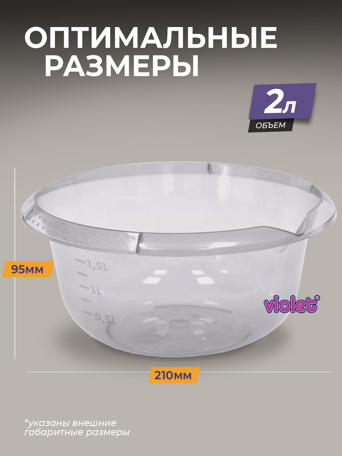 Миска с мерными делениями "VIOLET", 2л, 22х22х15см, цвет дымчатый