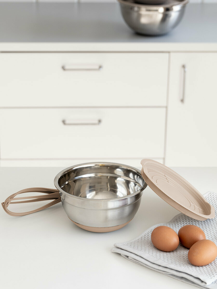 Миска для смешивания продуктов с крышкой DeNASTIA силиконовое дно D18, цвет бежевый A000232 интересное: