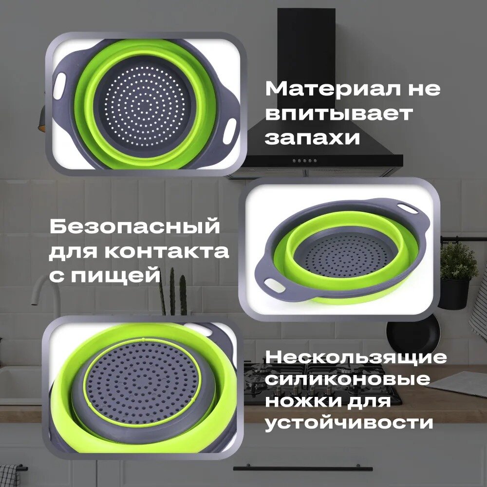 Дуршлаг складной силиконовый TAKARA NT1602 зеленый 4л, 23,5 см, сито с ручками для круп, макарон овощей и фруктов интересное:
